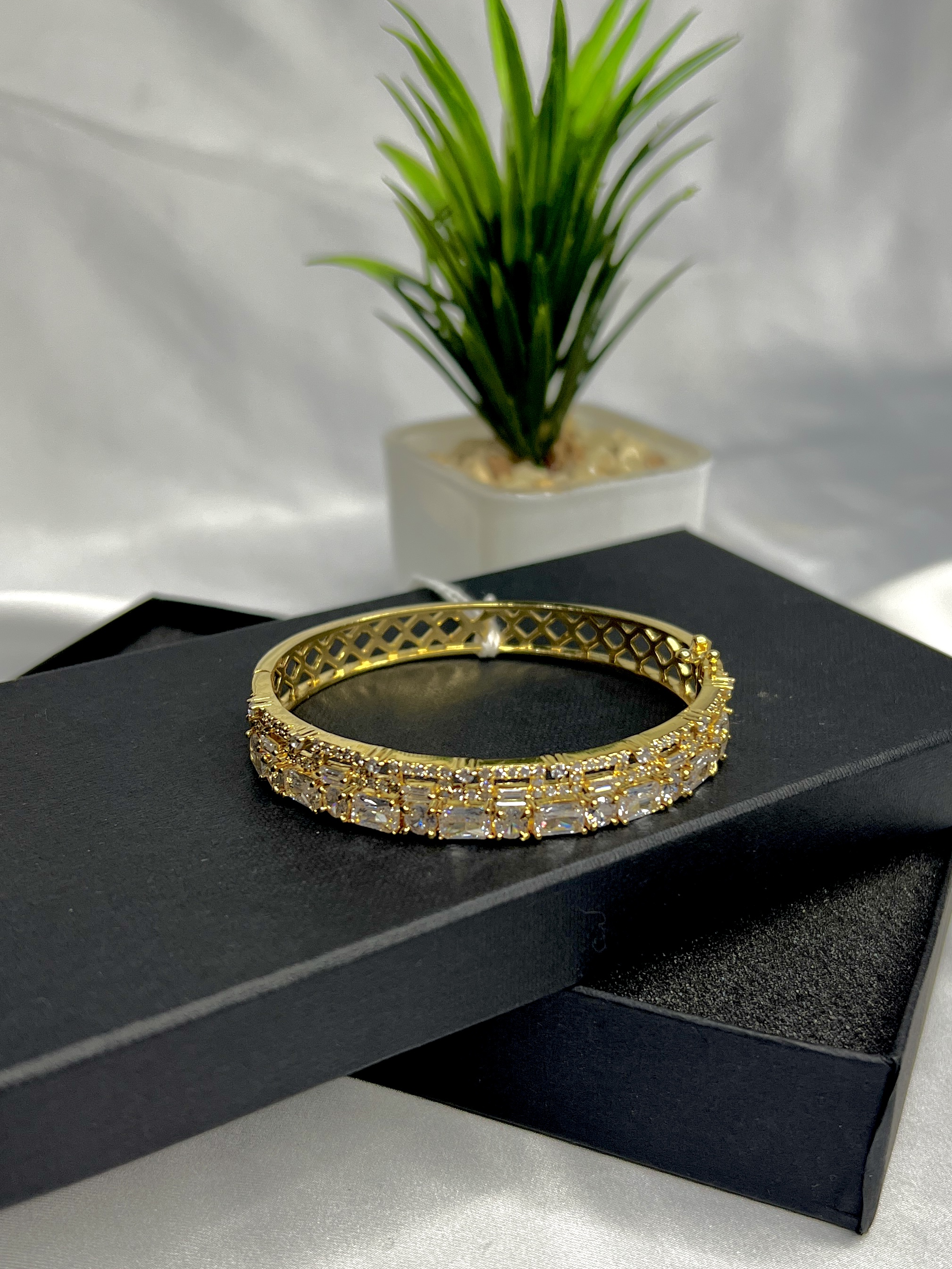 This timeless gold-toned bangle features rows of sparkling crystals in a classic design. Crafted with precision and care, this bracelet adds a touch of sophisticated elegance.