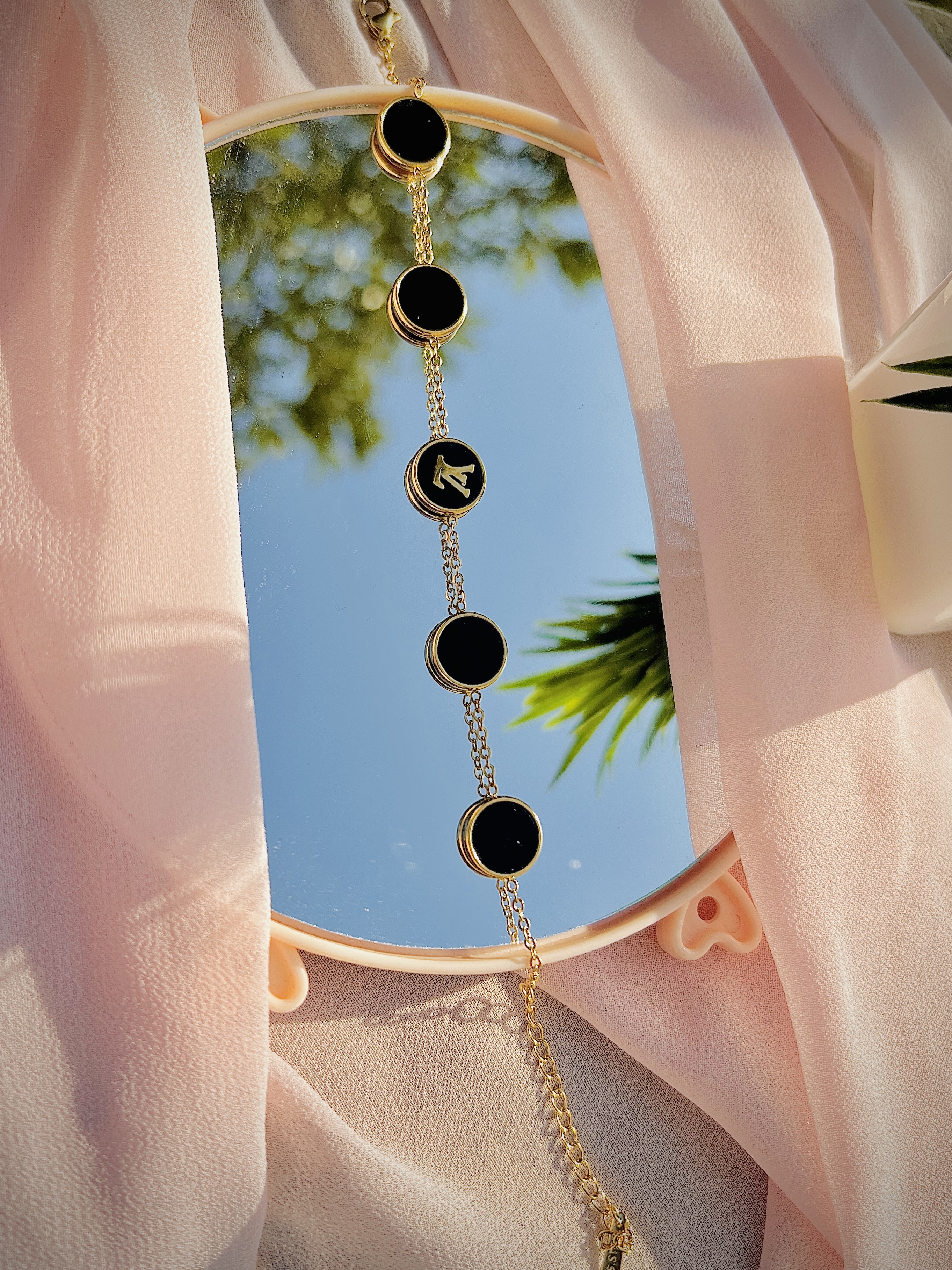 This stylish gold-tone bracelet features Circule inspired motifs connected by delicate chains. A beautiful and versatile accessory.