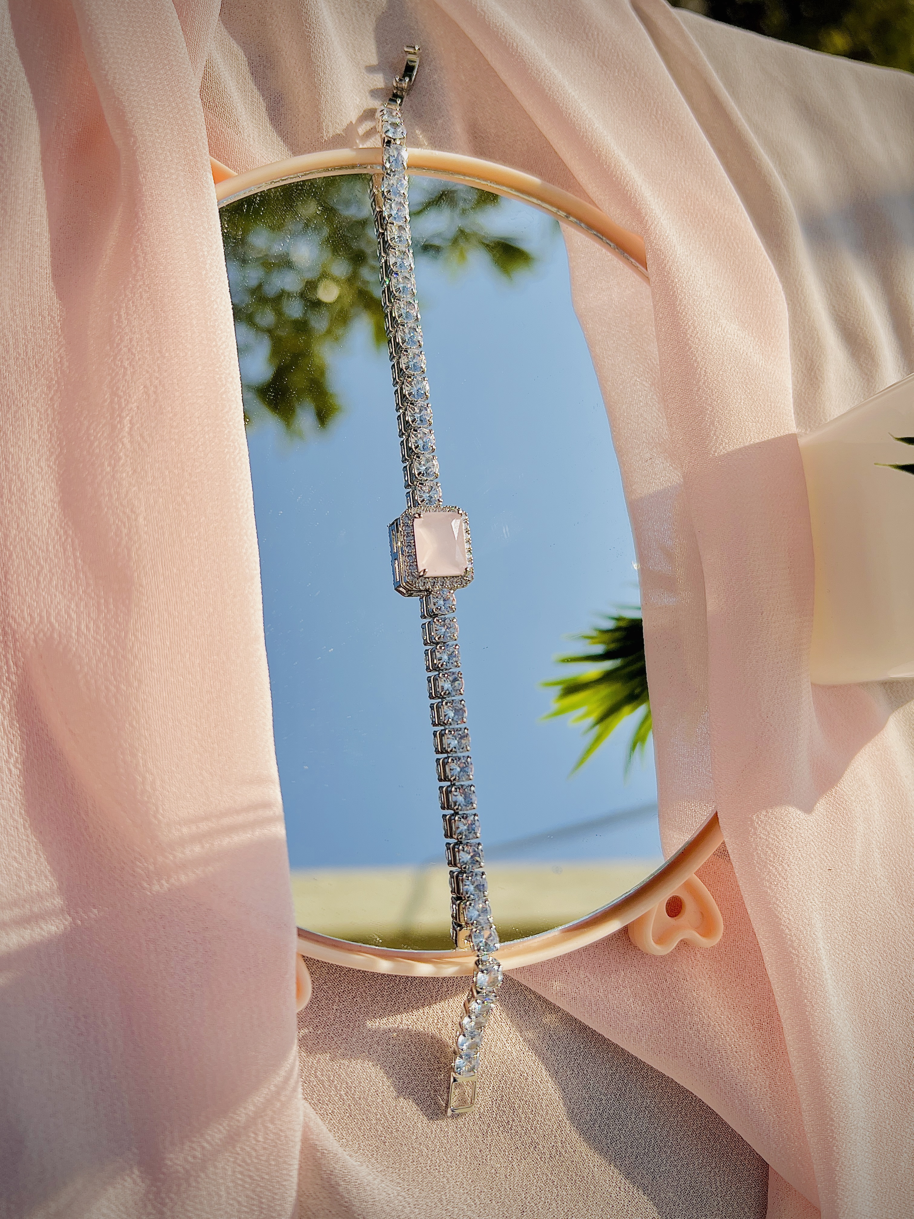 This striking bracelet features a continuous line of sparkling white crystals contrasted by a vibrant red square-cut stone at its center. A bold and elegant statement piece.