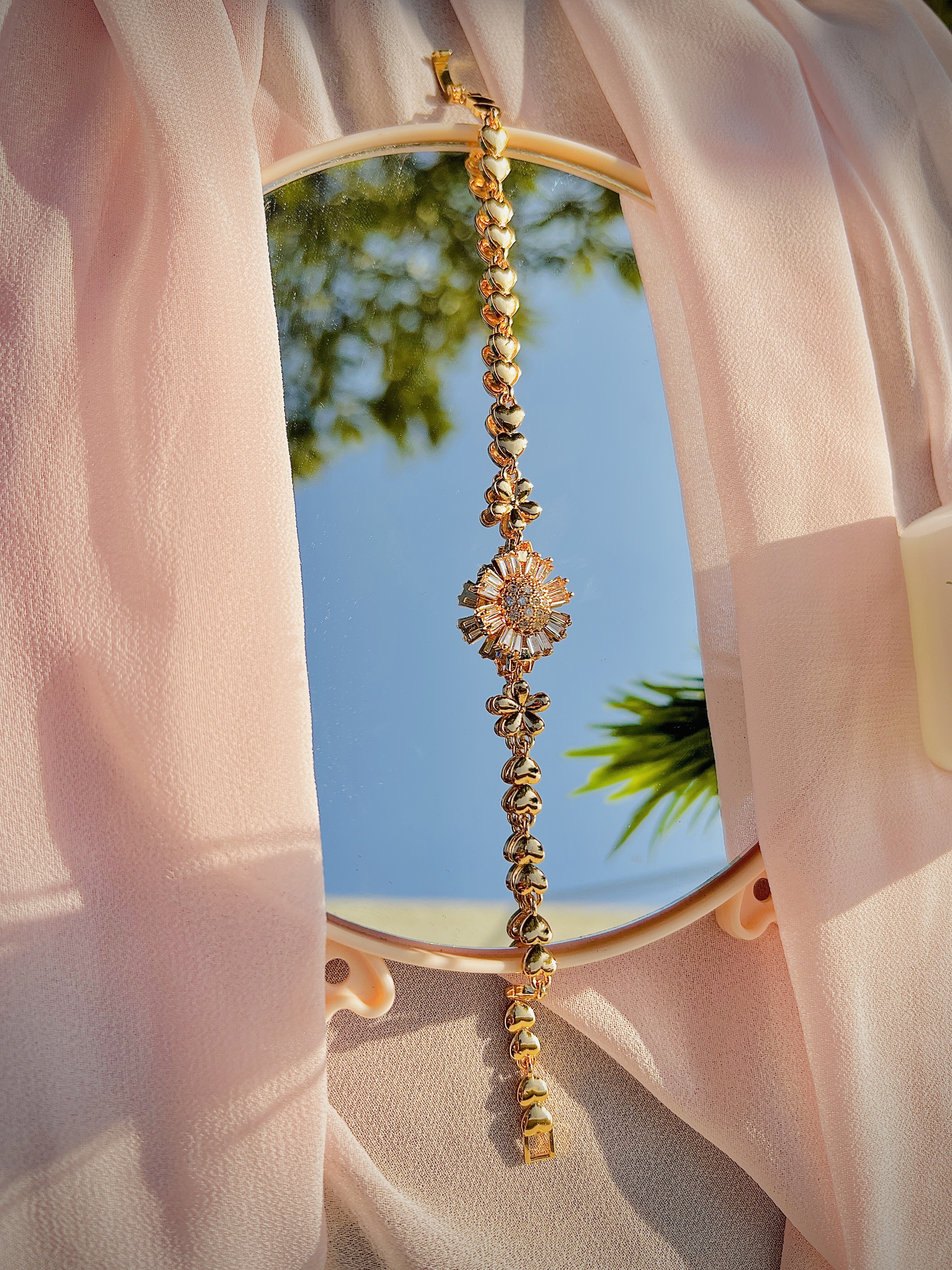 This charming bracelet features a delicate chain of sparkling crystals leading to a beautiful blue flower centerpiece. A perfect accessory for adding a touch of floral elegance to any outfit.
