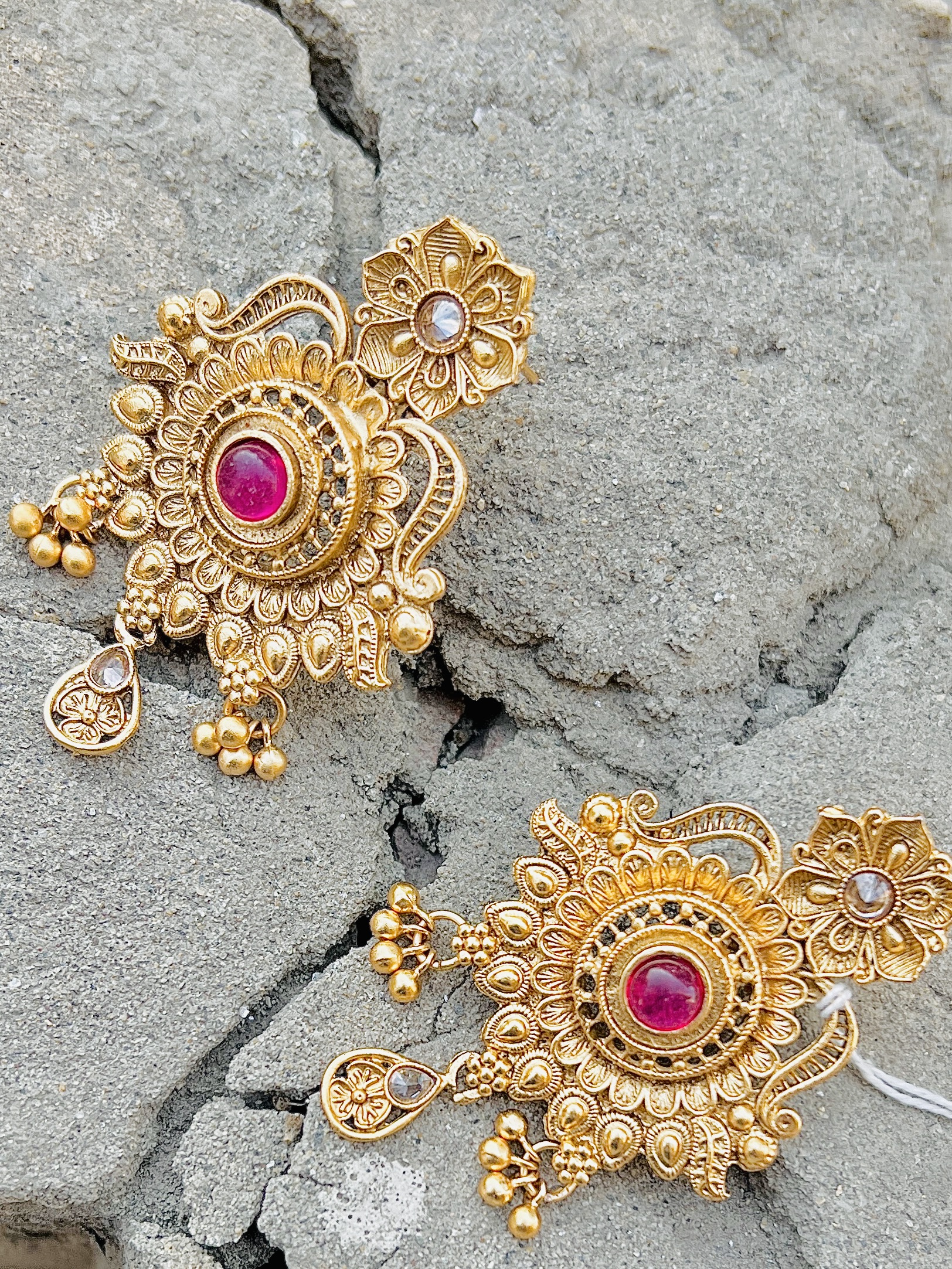 These ornate earrings showcase detailed metalwork in a floral motif, complemented by a deep red garnet at the center.
