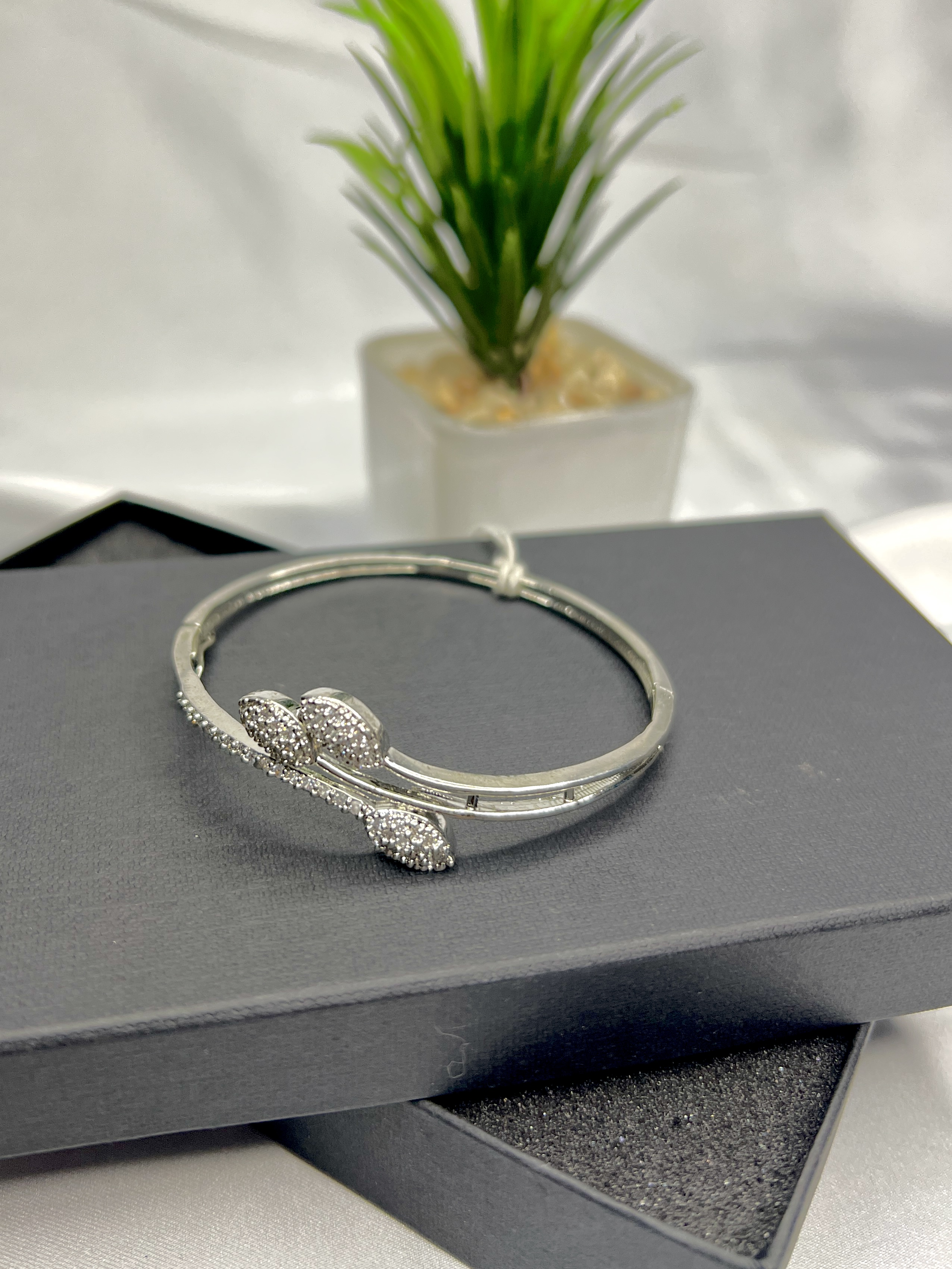 This stylish silver-toned bangle features a central blue stone surrounded by sparkling crystal accents. The combination of colors and textures adds a touch of sophistication.