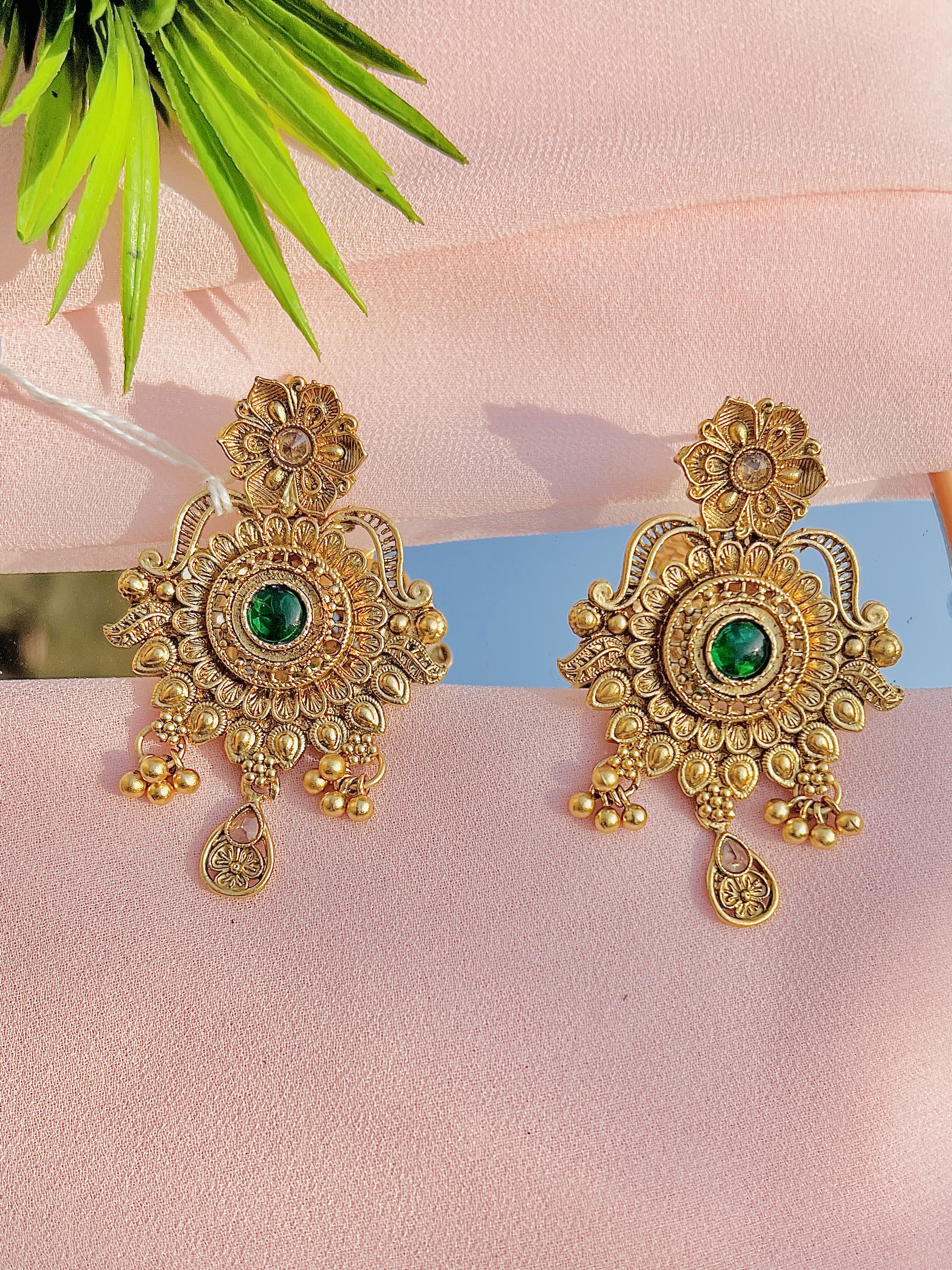 Intricately detailed jhumka earrings featuring delicate gold work and a vibrant emerald centerpiece.