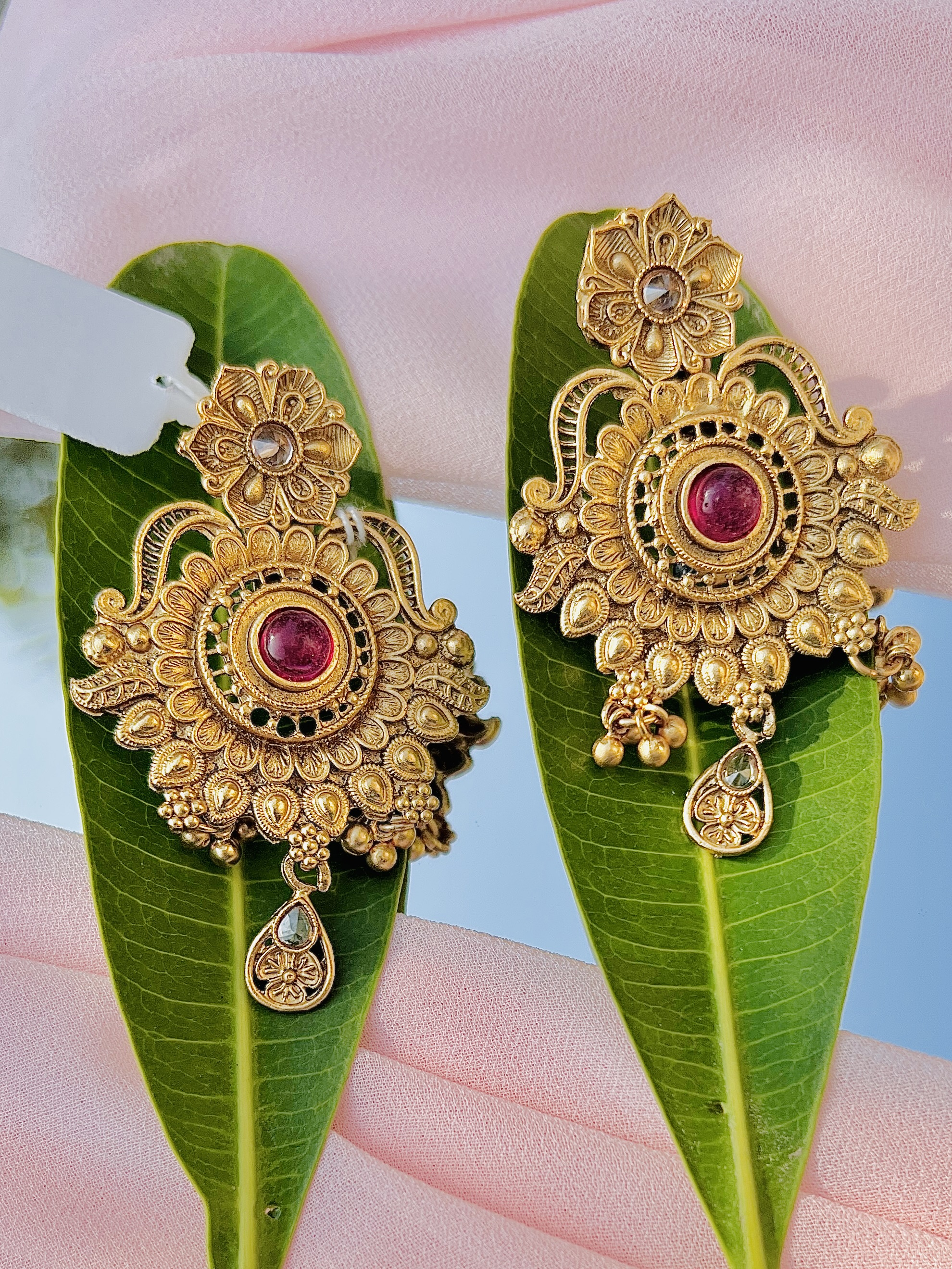 These ornate earrings showcase detailed metalwork in a floral motif, complemented by a deep red garnet at the center.