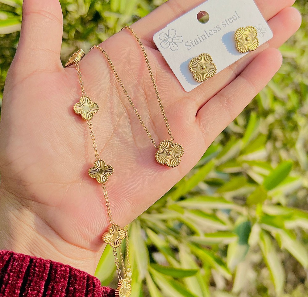 Stainless Steel Gold Plated Set Of White Anti Tarnish Clover Jewelry Set For Girls And Women